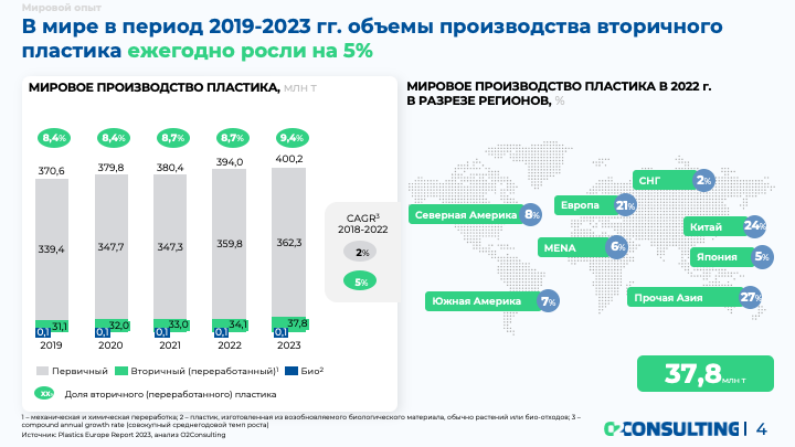Мировая статистика подтверждает, что в период 2019—2023 гг. объемы производства вторичного пластика ежегодно росли на 5%. Где-то на 5% в год растет производство пластиковых изделий из вторичного пластика. И сейчас изделия из вторичного пластика занимают долю порядка 9-10% в общем объеме производства пластиковых изделий.