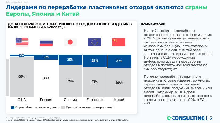США, несмотря на статус технологического лидера, демонстрируют низкий уровень переработки пластика. В данном контексте страна является антибенчмарком. Это связано с тем, что ранее американские компании «вывозили» большую часть отходов в Китай, который в 2018 году запретил ввоз пластиковых отходов из третьих стран. В США же необходимая инфраструктура для переработки до сих пор не развита в достаточной степени. Кроме того, в США используется сжигание отходов в целях получения энергии или масел: в стране доля переработанных пластиковых отходов в энергию составляет около 10%.