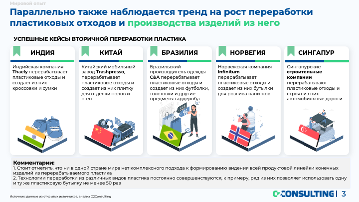 Другой способ снижения негативного воздействия — переработка пластика с целью производства новых изделий. Этот тренд распространен в Индии, Китае, Бразилии, Норвегии и Сингапуре. Многие компании, озабоченные ESG-повесткой, перерабатывают пластик в готовые изделия.